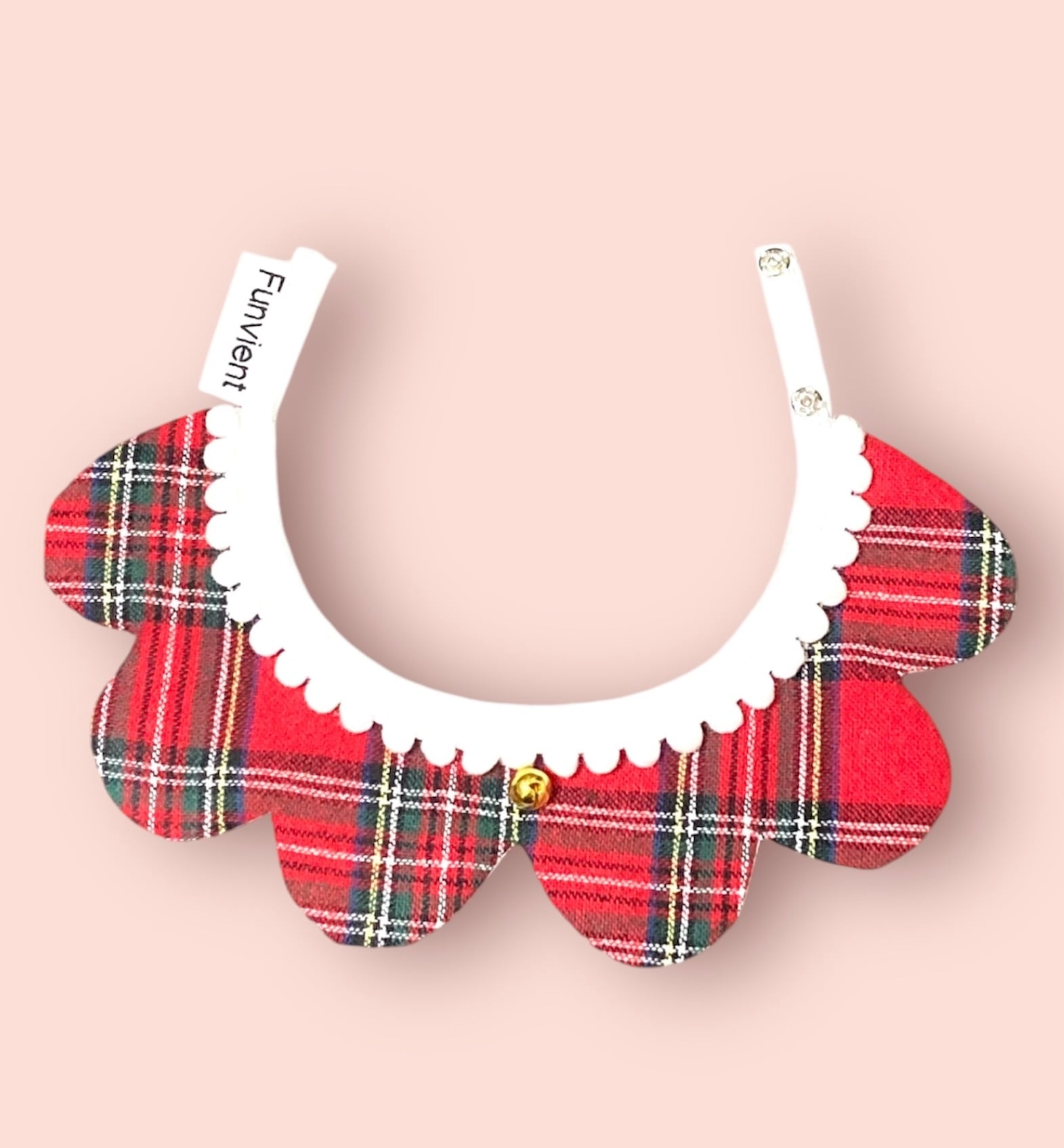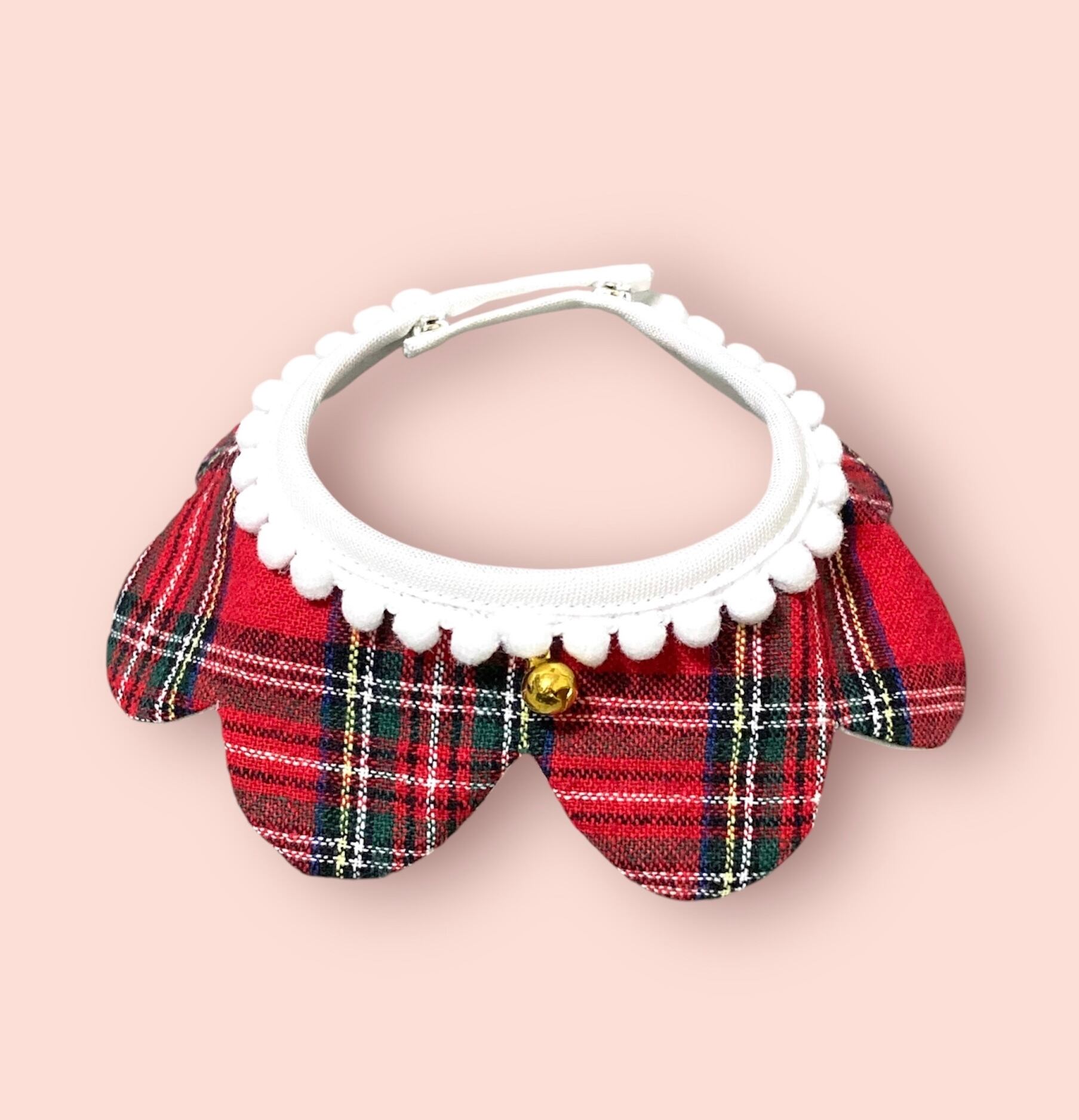 赤ベースのチェック柄に白い小さなポンポンを付けてクリスマスっぽさをイメージ。